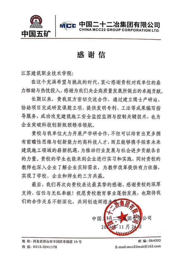 近日,中国二十二冶集团有限公司给我校发来感谢信,充分肯定了我校为企业高质量发展所做出的贡献。
