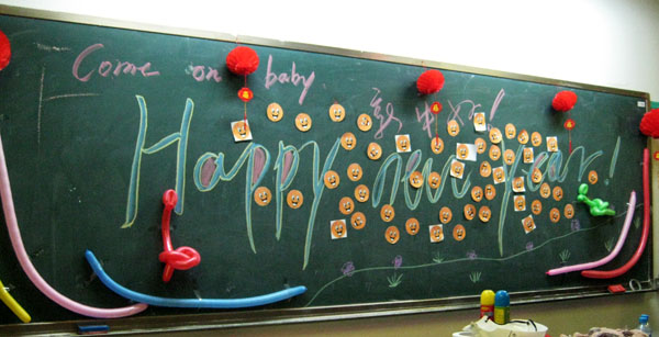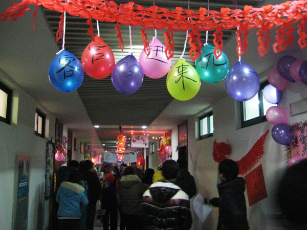 当天下午同学们早早的就来到教室挂气球,悬彩带,每间教室都洋溢着节日的气氛。按照活动要求,每班都要为自己班级的游园取名、策划闯关游戏,并分出三个游戏难度等级,分别设立有难度星级的奖券。学生会在大厅也摆设了特别摊位,开展“寄给新年某一天的自己的祝福”活动。